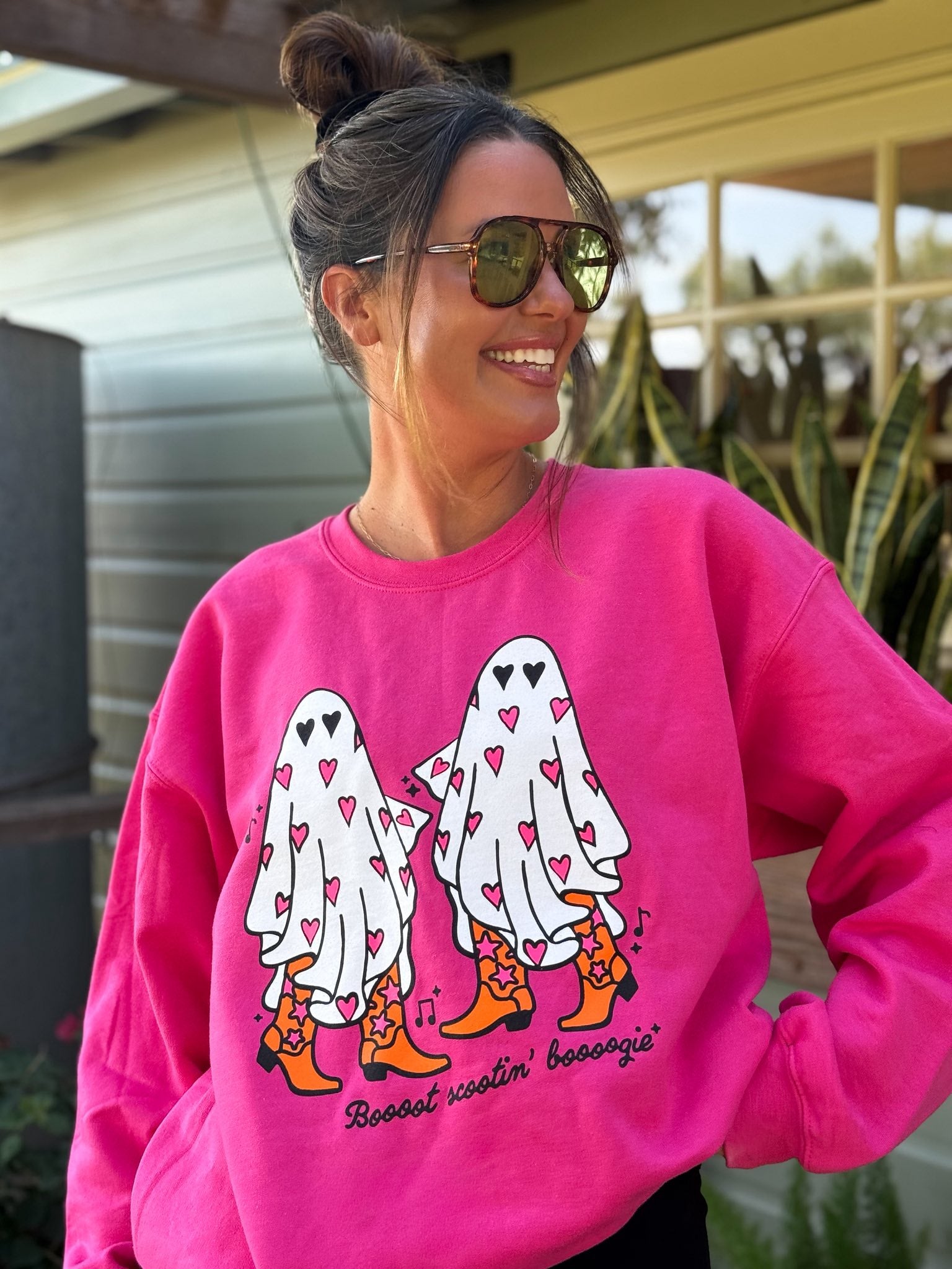 Boot Scootin' Booooogie Sweatshirt. Spooky cute design. Whether you're chasing ghosts or just good vibes, this is the perfect fit for fall fun. Color: Hot Pink. Sizes: S, M, L, XL, 2X.