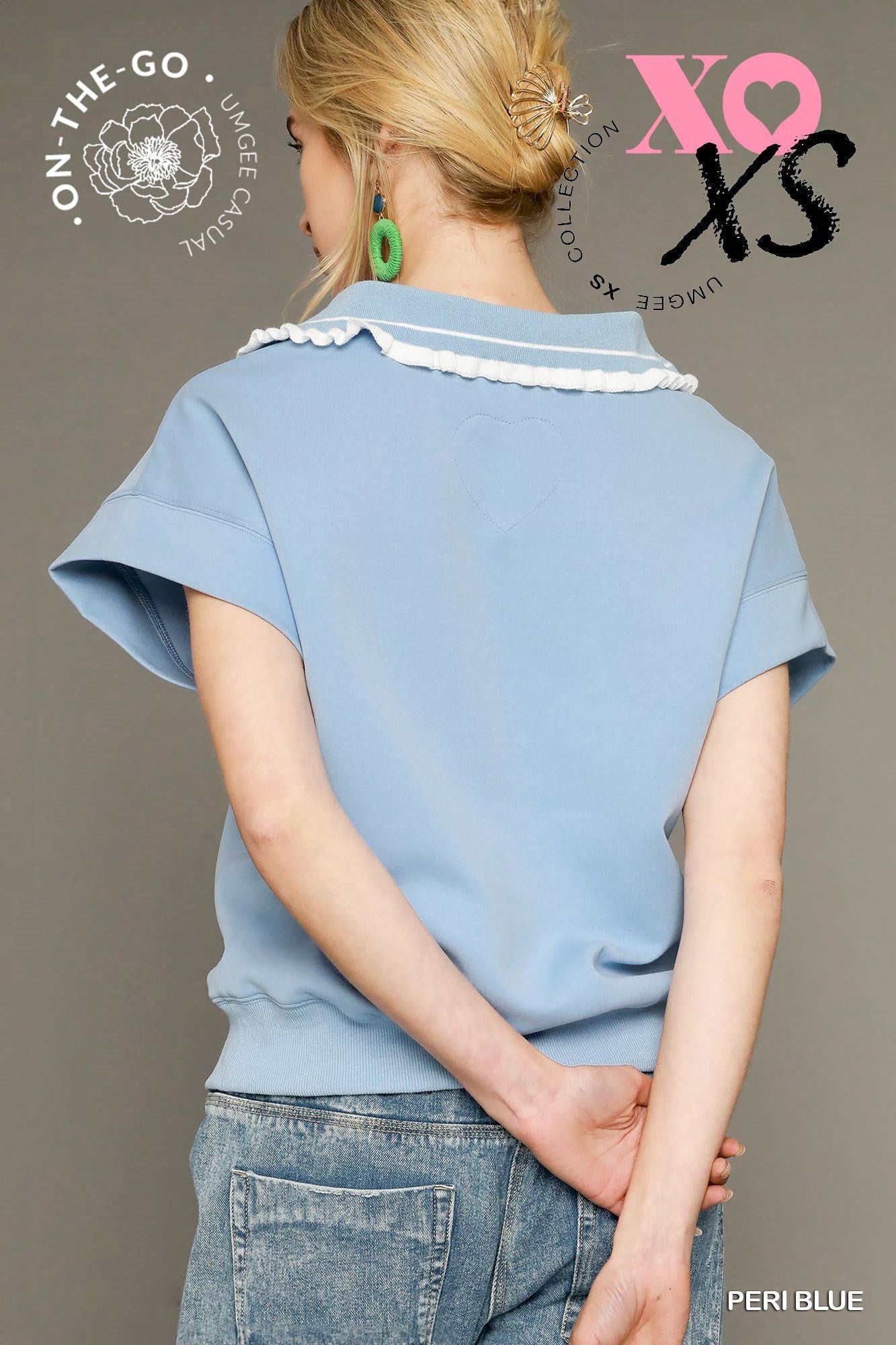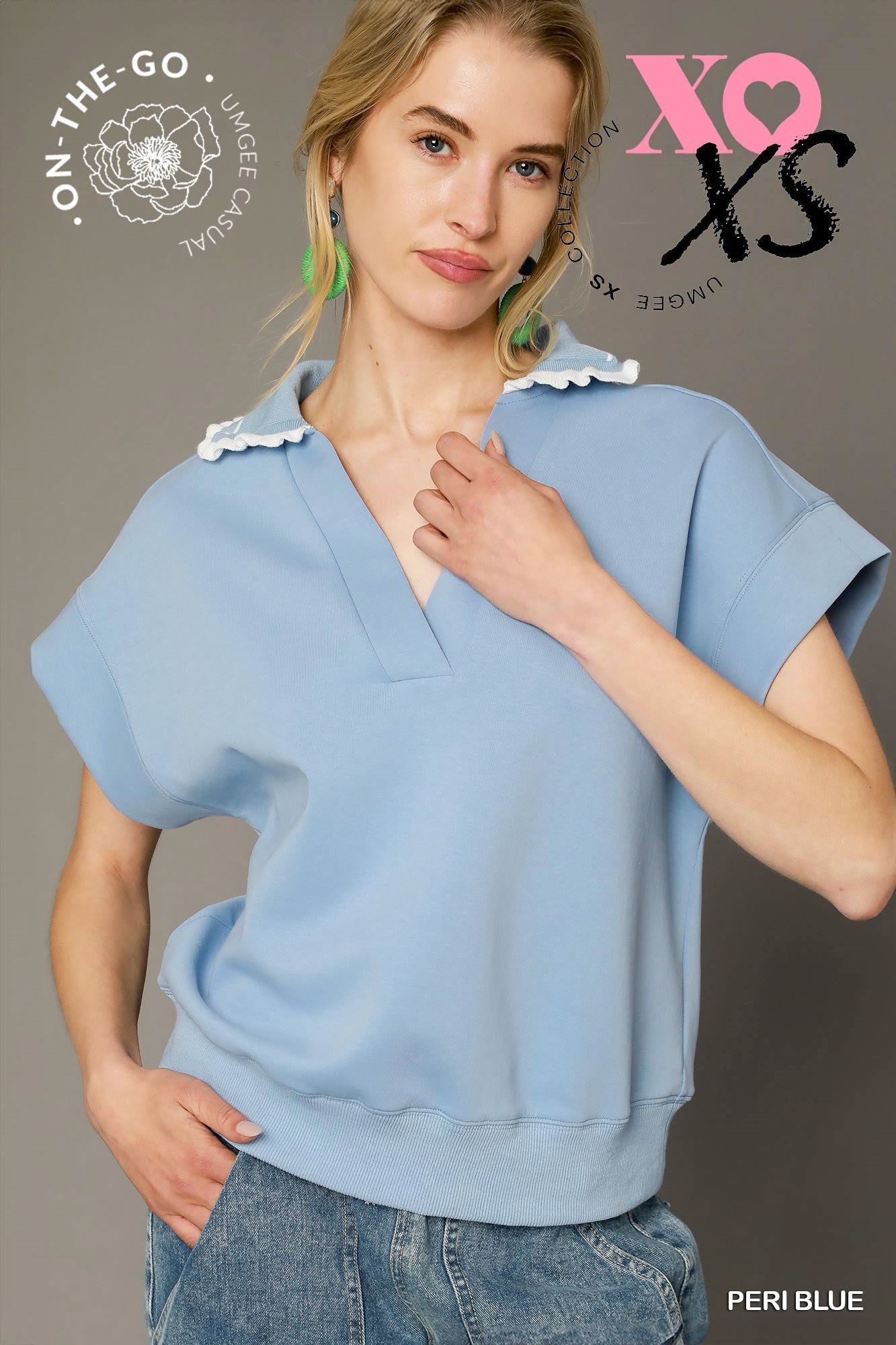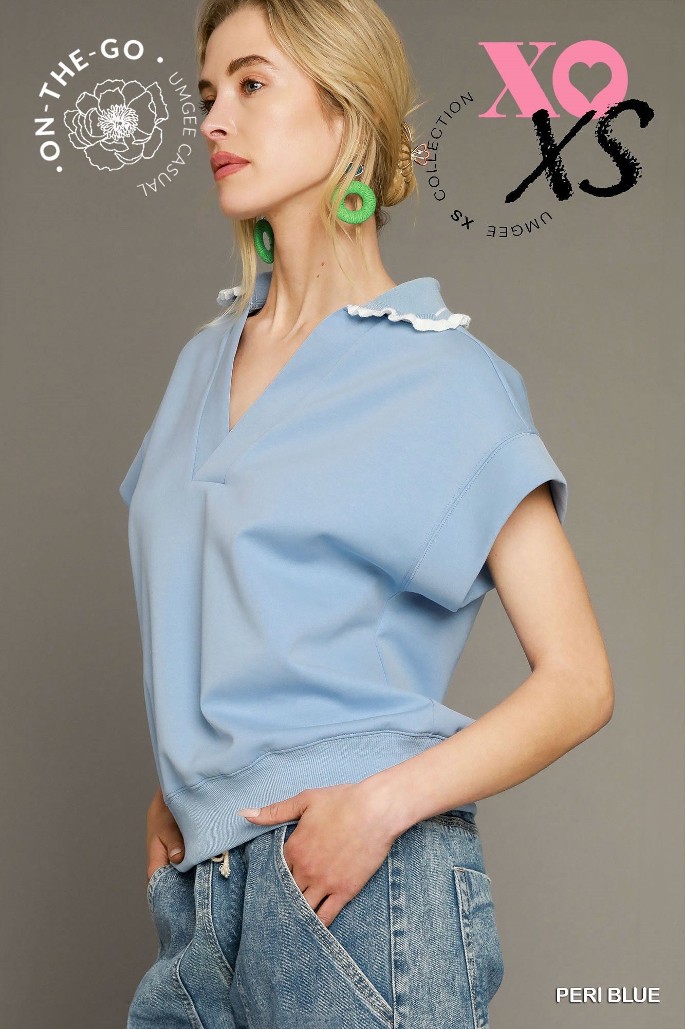 Carrie Top. Luxeknit, V-Neck, Pullover Top. Ribbed Hemline; Deep V-Polyester, 10% Spandex. Color: Peri Blue. Sizes: XS, S, M , L.