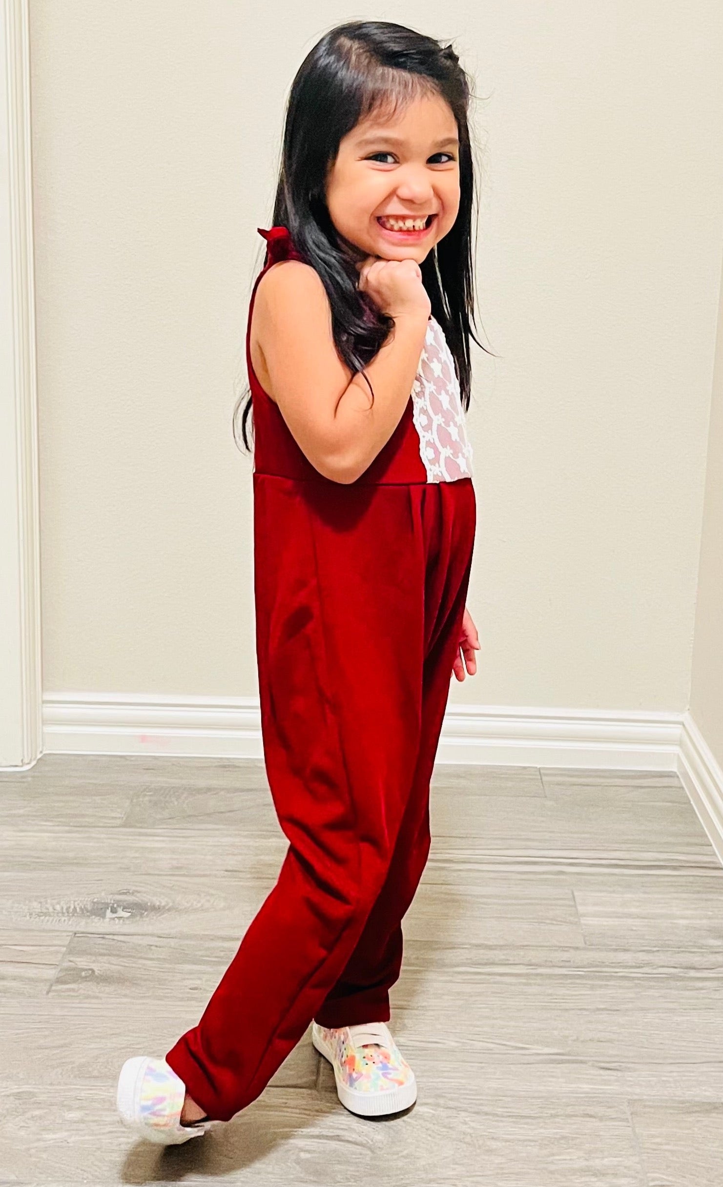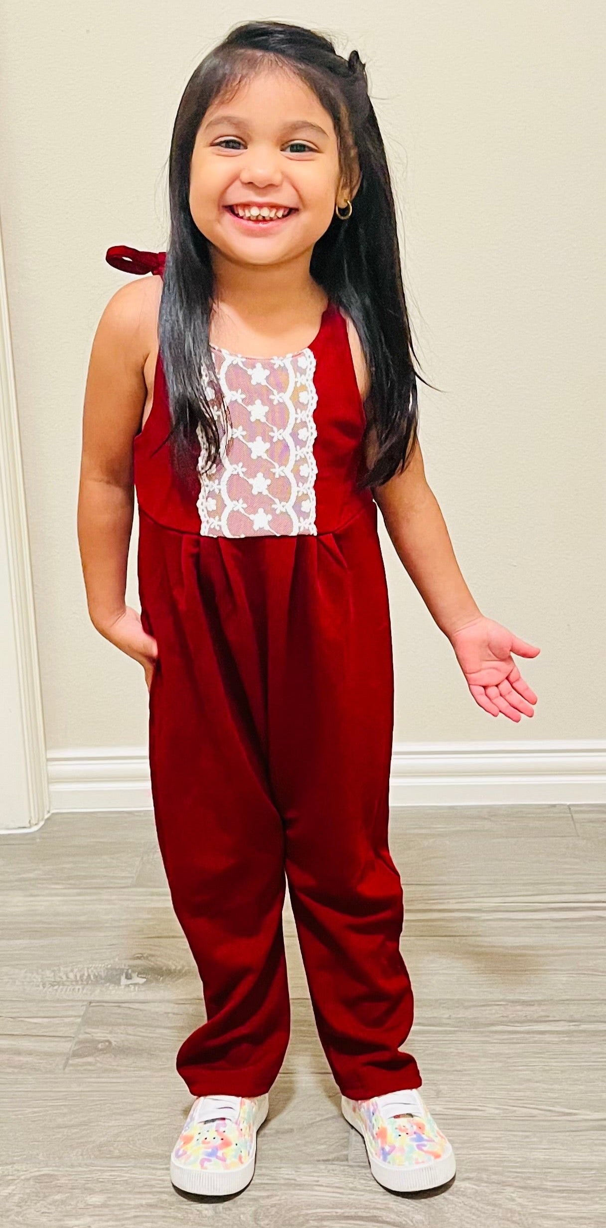 Clementine Tie-Strap Bubble Jumpsuit. The Clementine Tie-Strap Bubble jumpsuit is here and we are feeling obsessed. With ties on the straps and a lace embelishment on the bib. This item runs true to size. 95% Polyester, 5% Spandex.