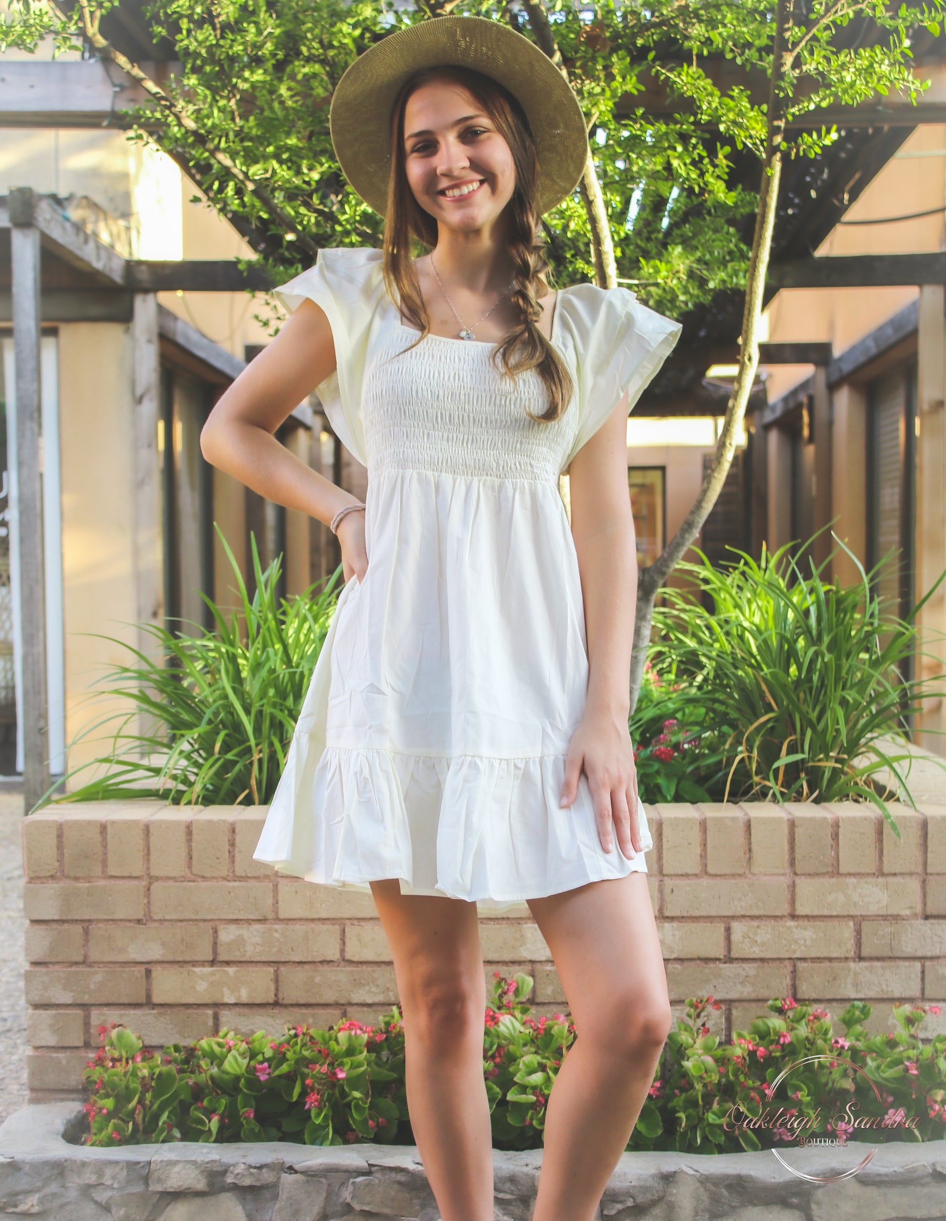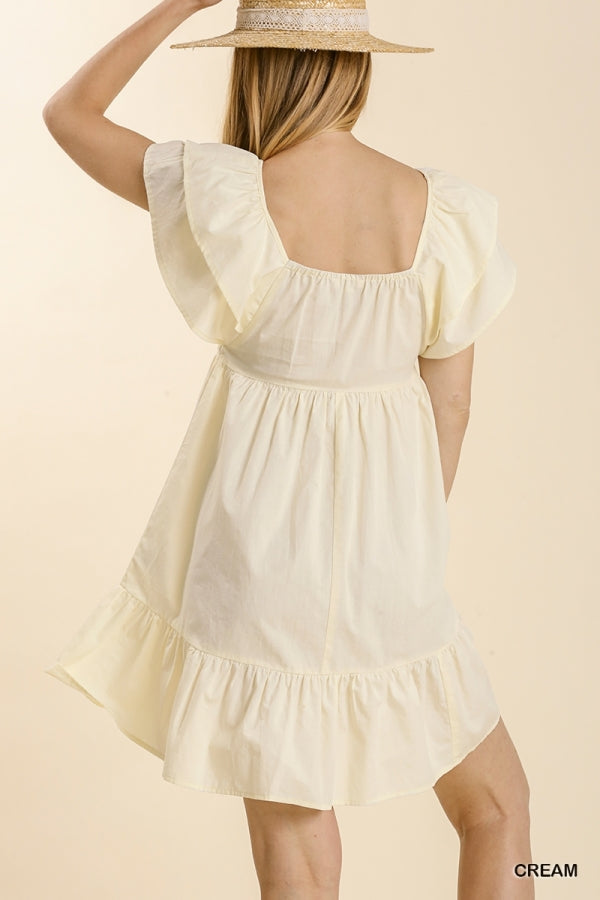 Cool Summer Dress. Smocked poplin shirred front, short double ruffle sleeve, with layered ruffle hem dress. No lining. 100% Cotton. Color:: Cream. Sizes: S, M, L.