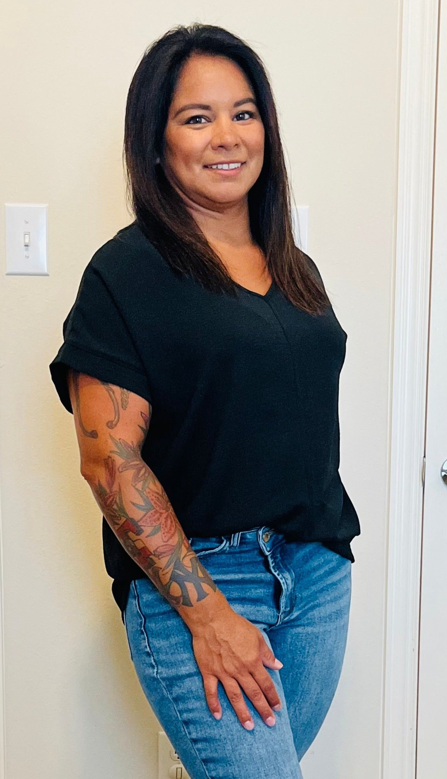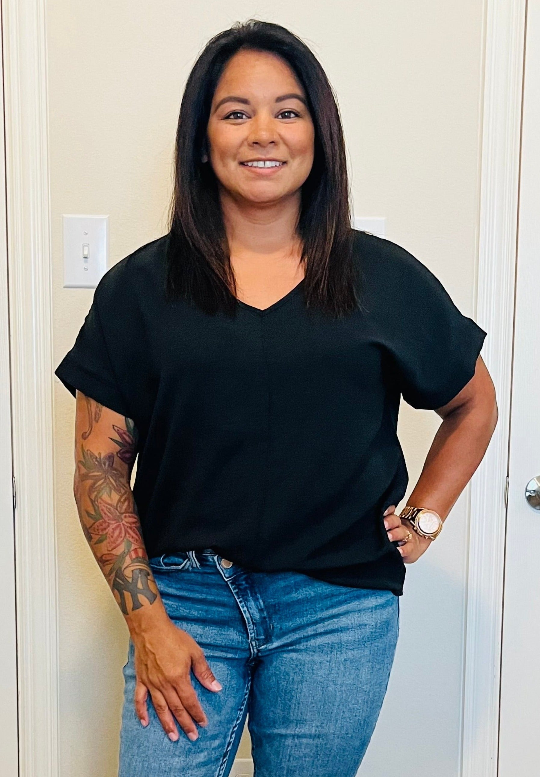 Cassi Top - Black. Short sleeve top. 100% Polyester. Colors: Black, Pink Berry. Sizes: S, M, L, XL.