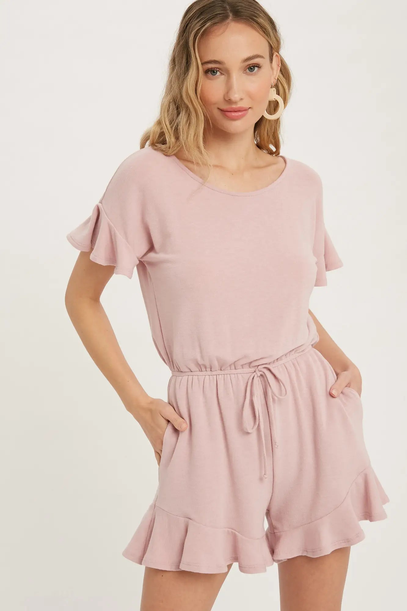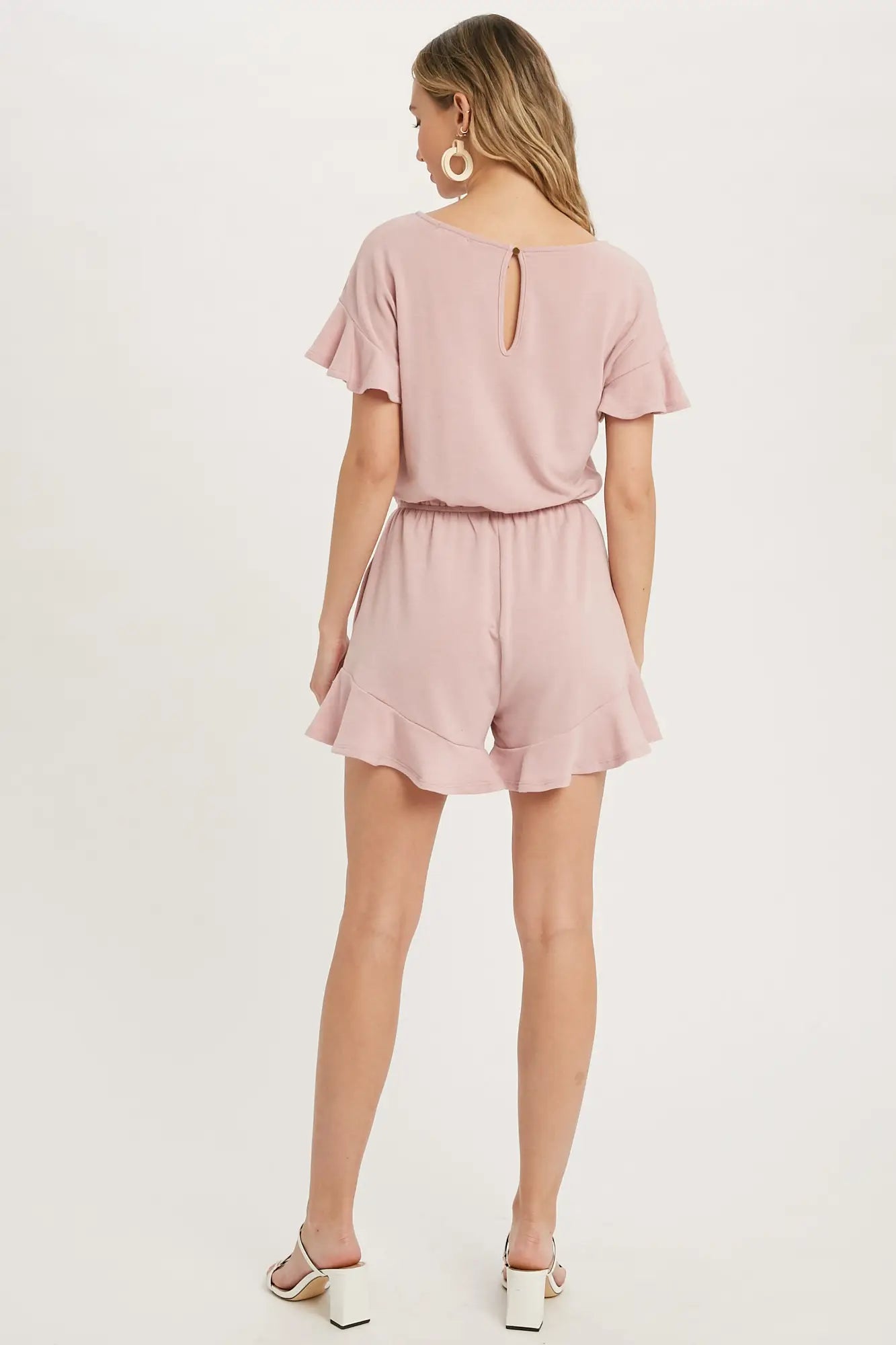 DR00522 - Ruffle Hem Romper. French terry romper featuring a round neckline, short ruffled sleeves, ruffled hemline detailing, side seam pockets, elastic waist, and a button back opening. -Model is 5'9" and wearing a Small. Colors: Rose, Sage. Sizes: S, M, L.
