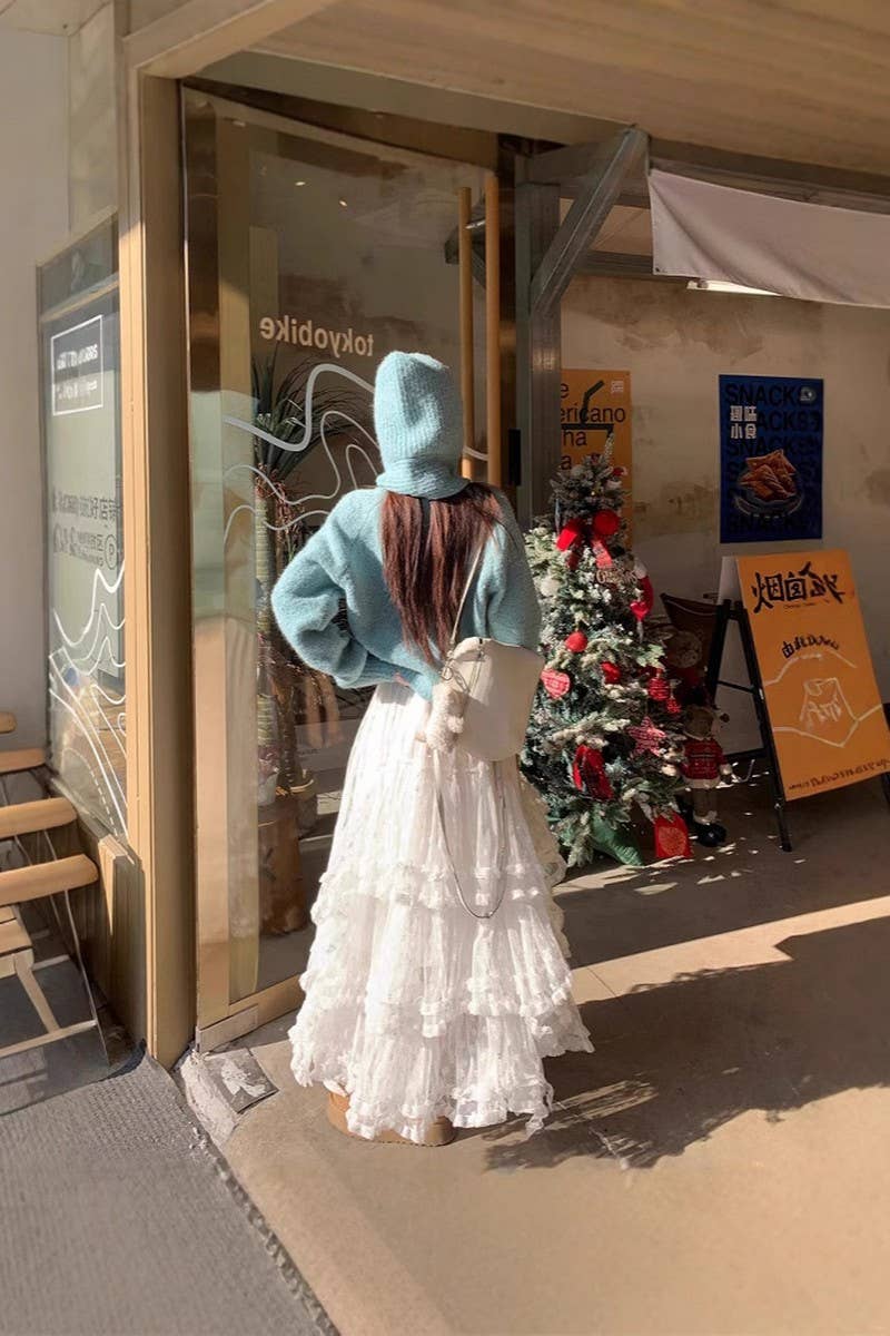 Floral Mesh Ruffle Irregular Maxi Skirt. High waisted, crochet floral lace, tiered maxi skirt. 100% Polyester. Sizes: S,M,L,XL