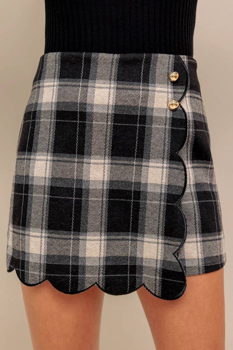 Michael Plaid Mini Skirt. High waist, black and white plaid print, tulip hem detail. 90% Polyester, 10% Wool. Sizes: S,M,L,XL