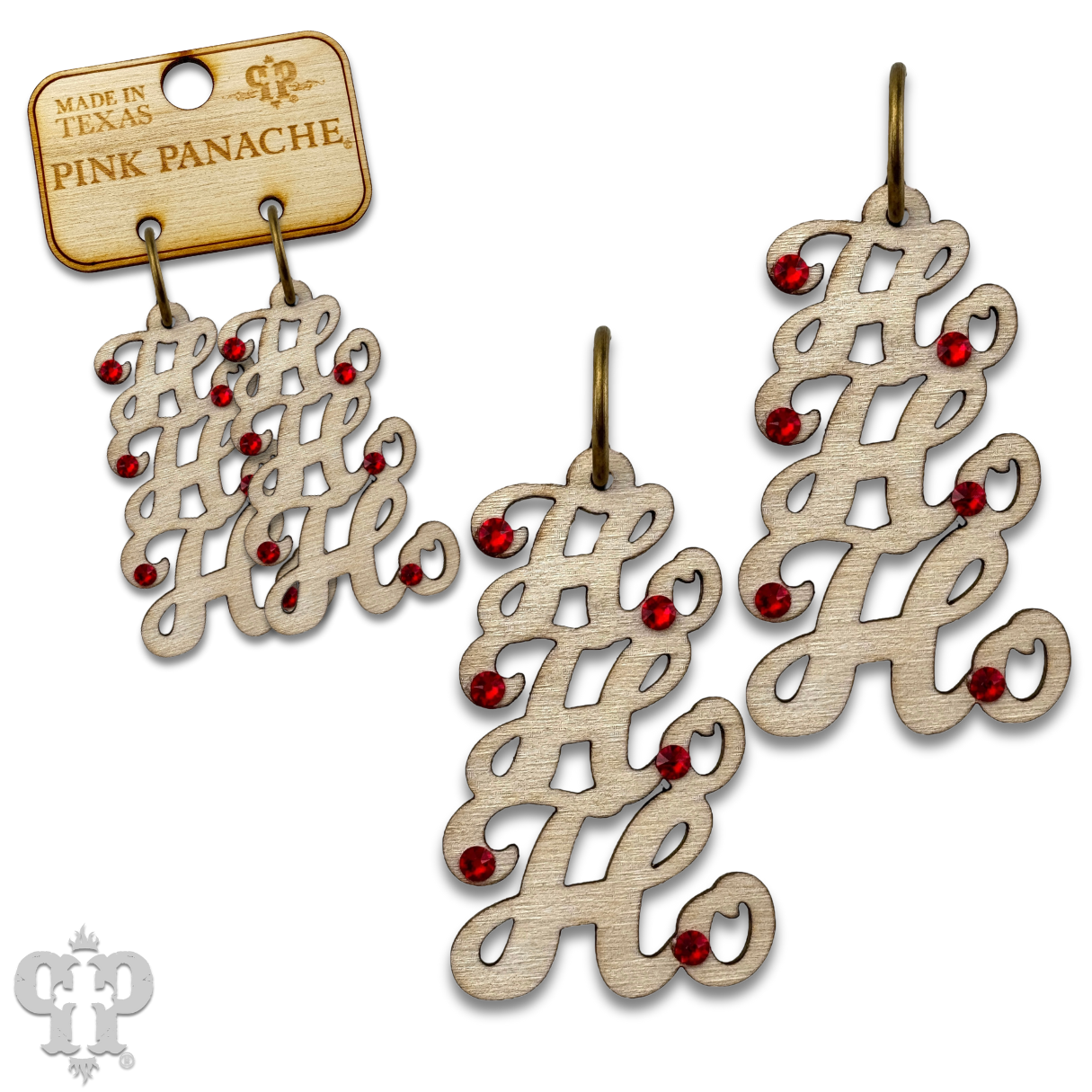 HoHoHo script earring - White. These laser cut wood earrings have "Ho-Ho-Ho" in script letters. Accented in handset Austrian crystals and they hang from a mini hoop. Laser cut script "Ho-Ho-Ho", Handset Austrian crystals. Approximately 2.25 inches in length.