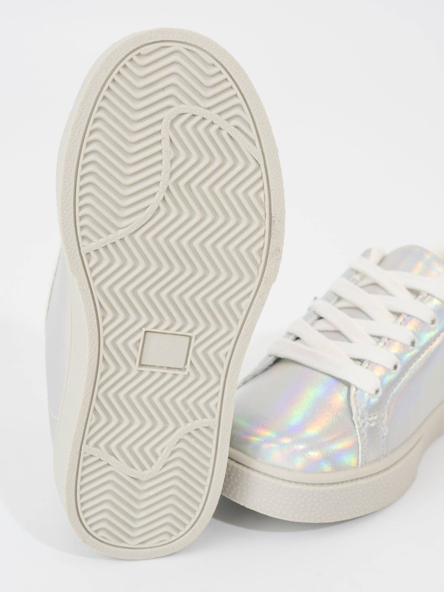 Holographic Sparkle Star Sneaker - Silver. Be a super star and sparkle wherever you go with these glittery, glam sneakers! The comfortable fit means you can dress them down to run errands or dress them up with one of our sparkly tutu dresses. Your little will be the star of the show every time you slip these sneakers on. Rubber Sole. For best fit, measure your child's foot from heel to length of the longest toe. Use size guide for the best size according to your child's foot length. 100% man-made materials. Colors: Holographic Gold, Holographic Silver. Sizes: 8, 9, 10, 11, 12, 13, 1Y, 2Y, 3Y.