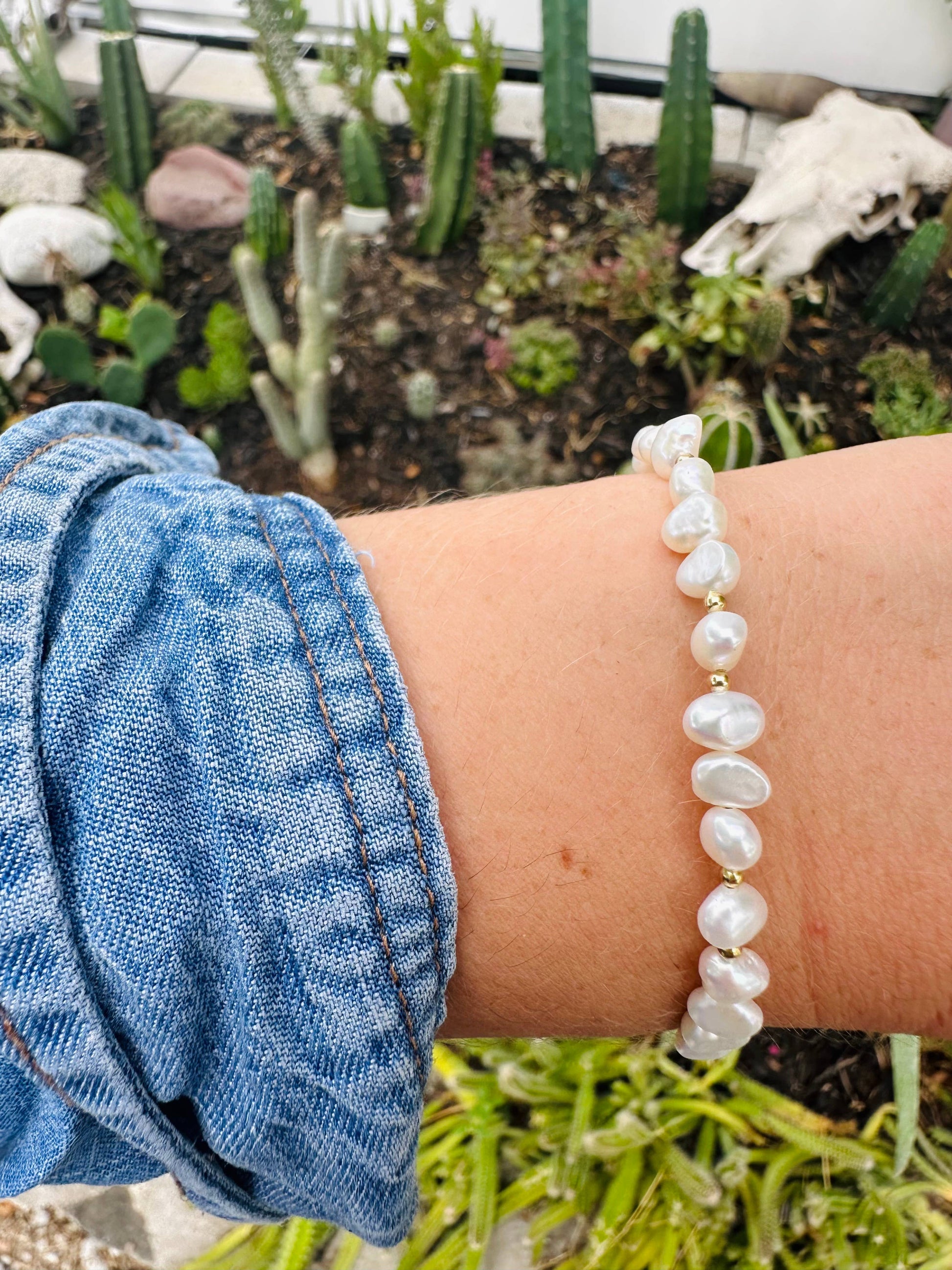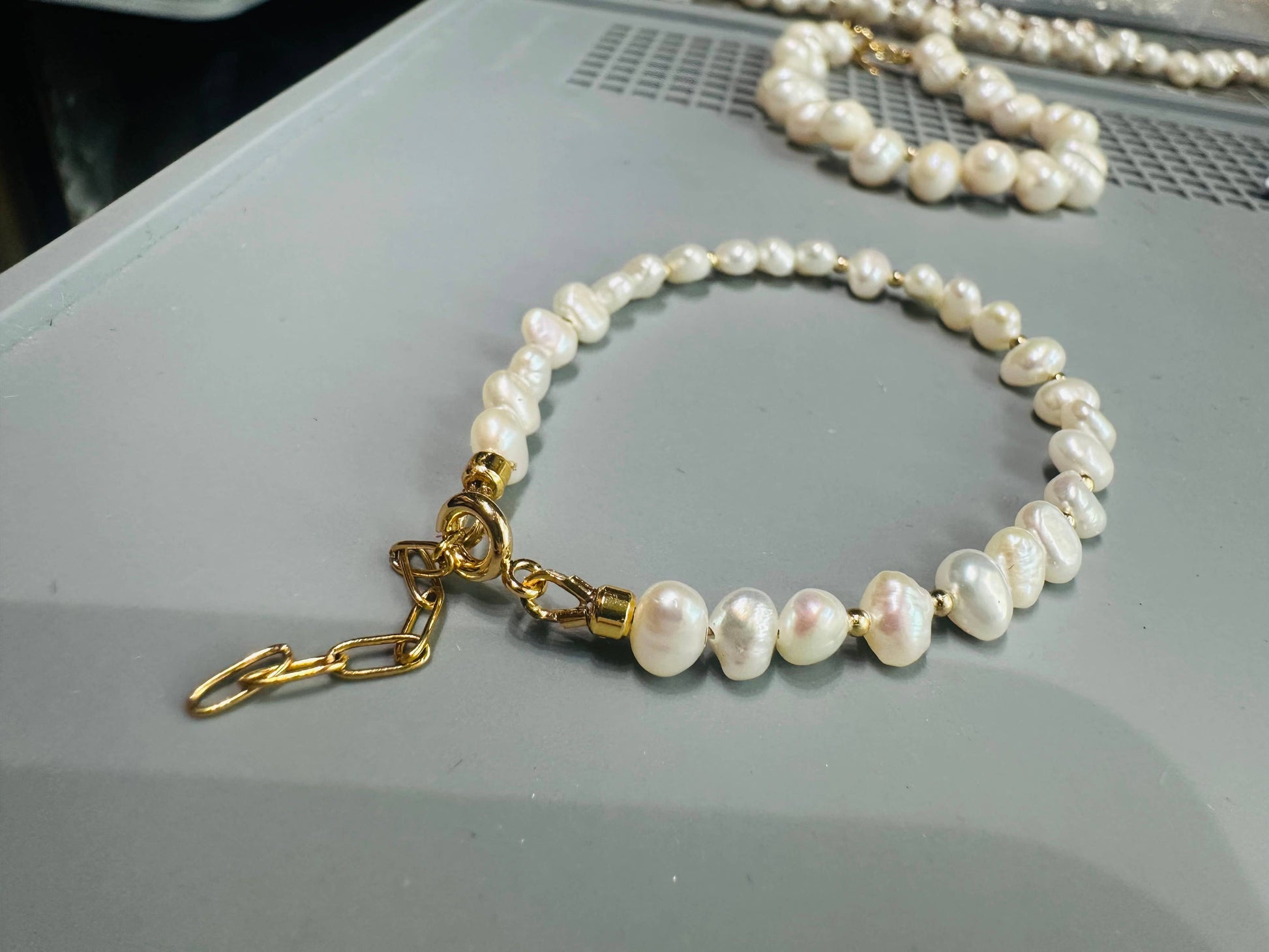 Genuine freshwater pearls paired with delicate complimenting gold. 18k gold coated sterling silver 925 findings & 18k gold plated paperclip extending chain.