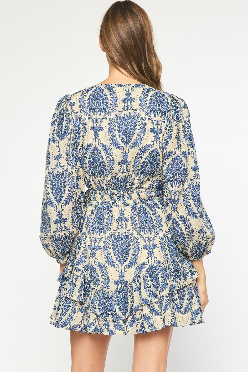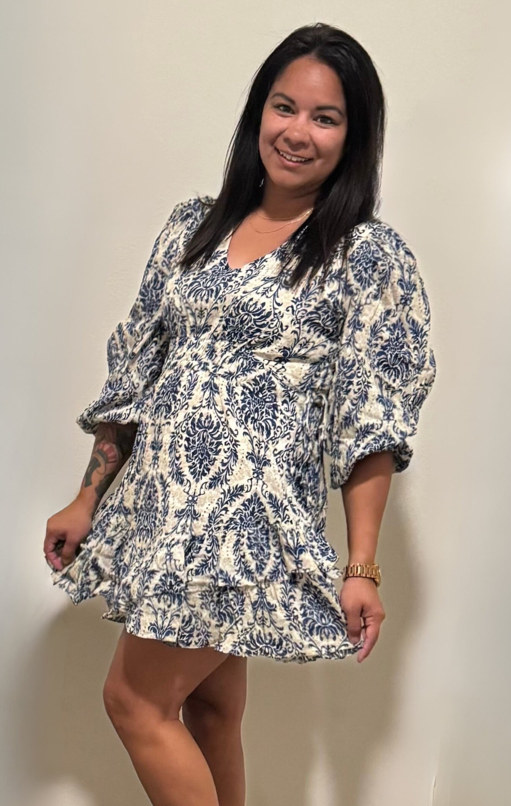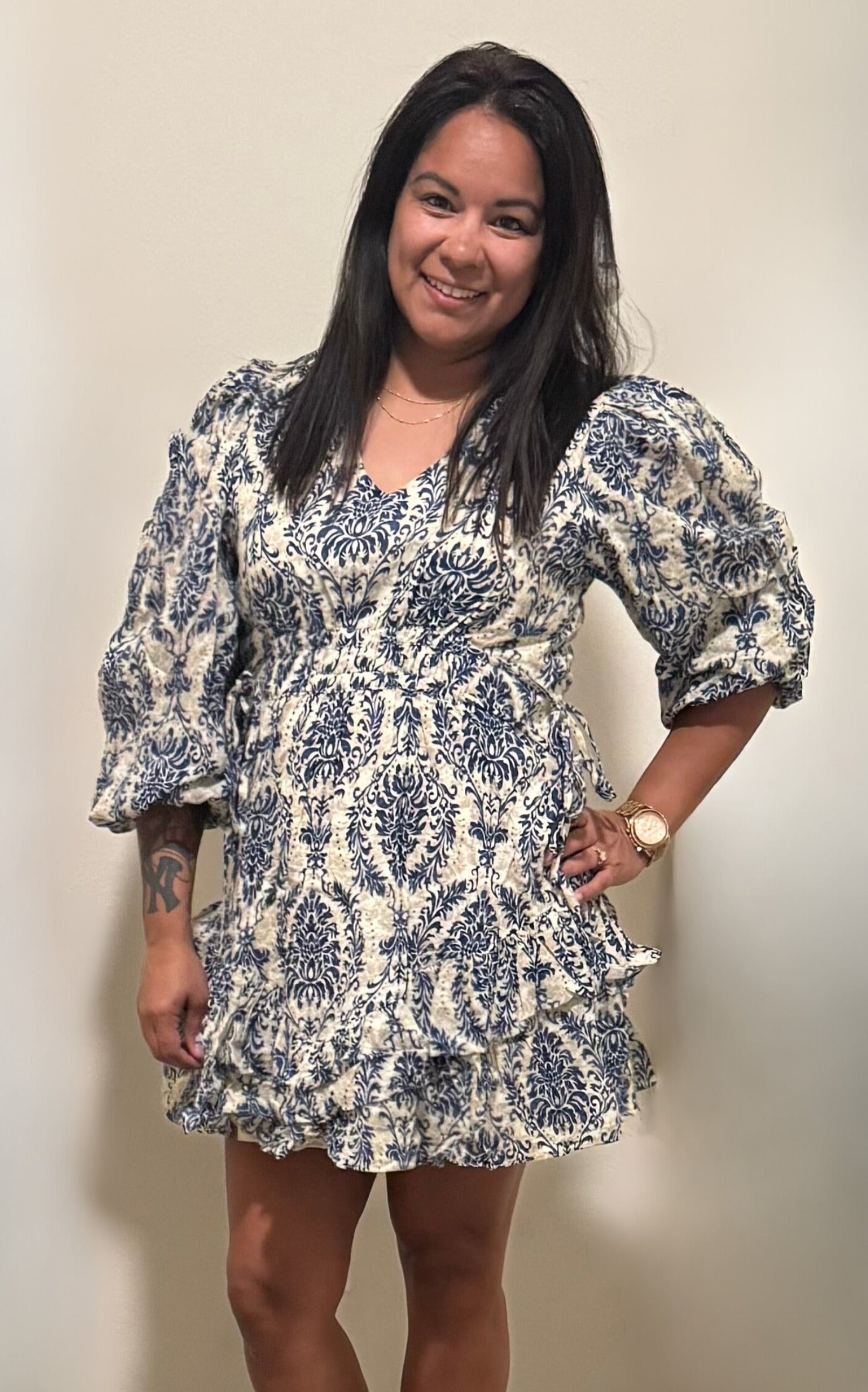 Jenn Dress. Printed balloon sleeve mini dress featuring self tie at sides. Elastic at waist and cuff, lined, woven, non-sheer, lightweight. 100% Cotton. Color: Midnight. Sizes: S, M, L.