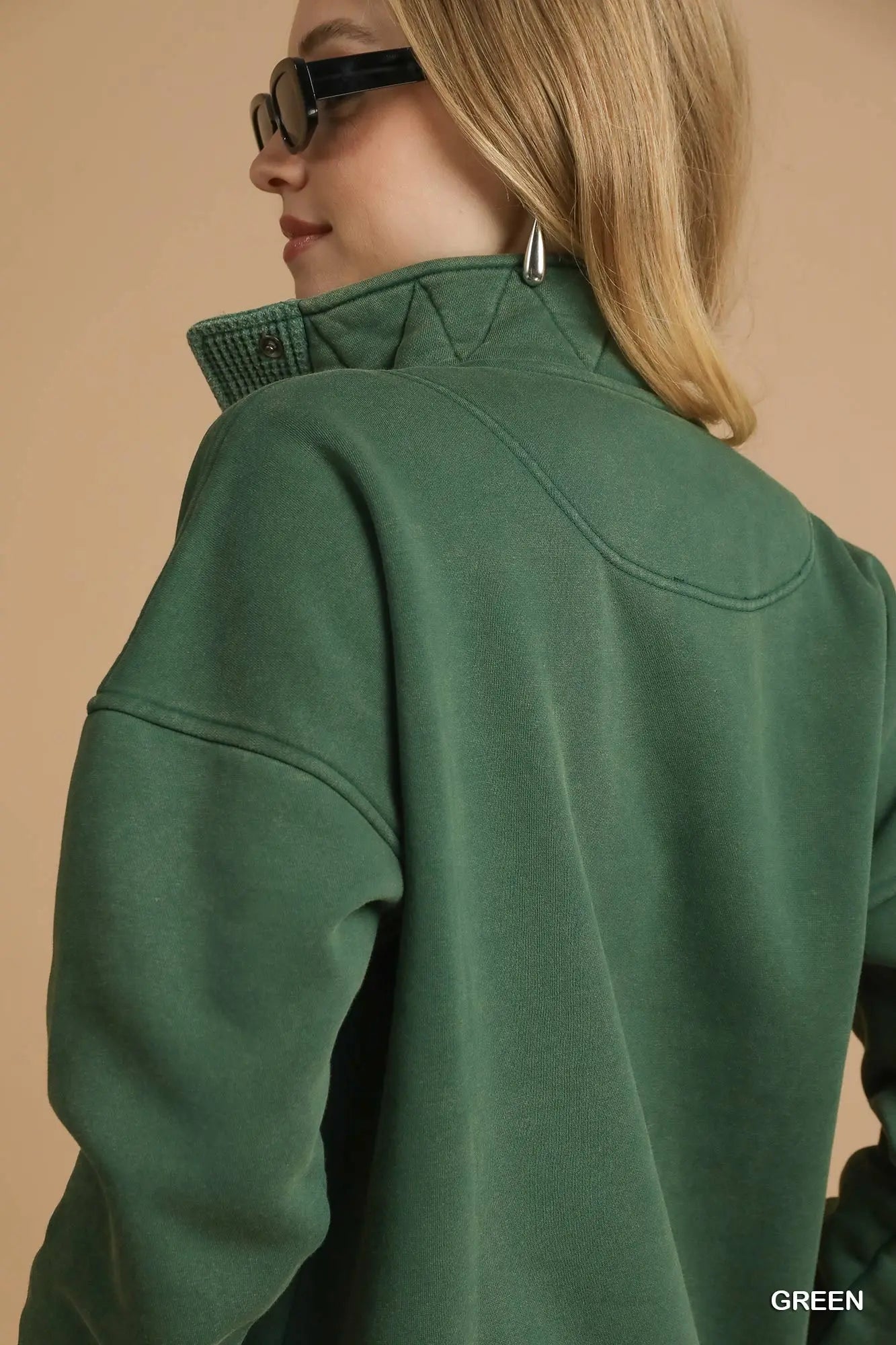 Looking Good Sweatshirt - Green. Mineral wash, half-snap pullover sweatshirt. Mineral wash, French Terry, half-snap, ribbed cuffs and hem, not lined. 65% Cotton, 35% Polyester. Color: Brown, Green.