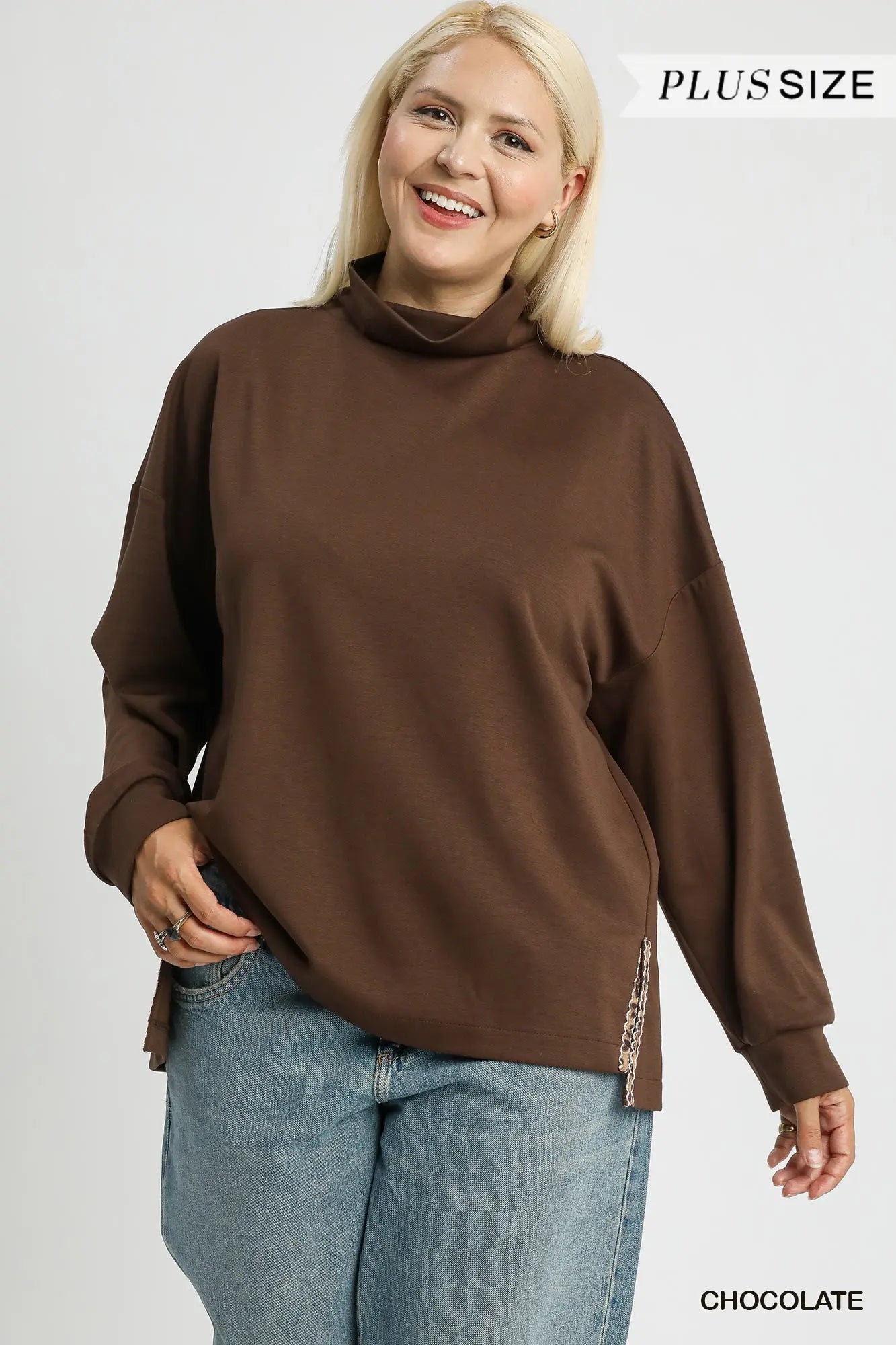 On The Move Top - Chocolate. Luxeknit Oversized Pullover. Dolman Sleeve; Turtle Neck; Side Slit; Contrast Detail; Not Lined; 55% Rayon, 40% Polyester, 5% Spandex. Colors: Chocolate, Navy. Sizes: XS, S, M, L.