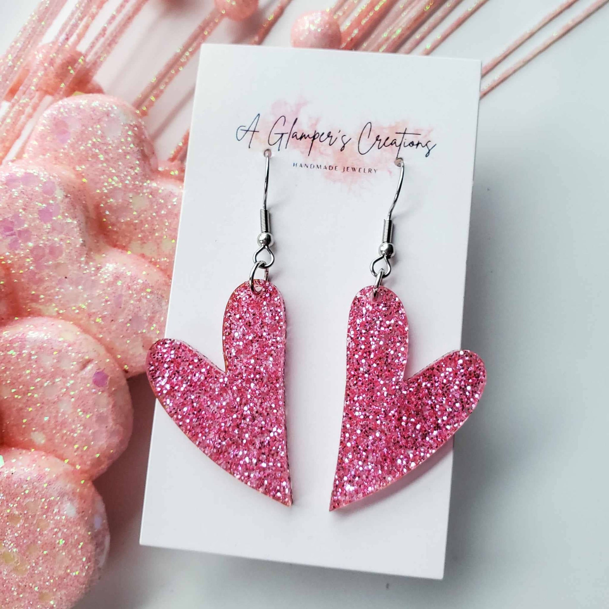 Pink Glitter Whimsy Heart Valentine's Acrylic Earrings. These are perfect for Valentine's Day! Lightweight earrings that are made of high quality acrylic. Dimensions: approximately 1.5 inches Hooks are hypoallergenic stainless steel and come with rubber backings on an earring card.