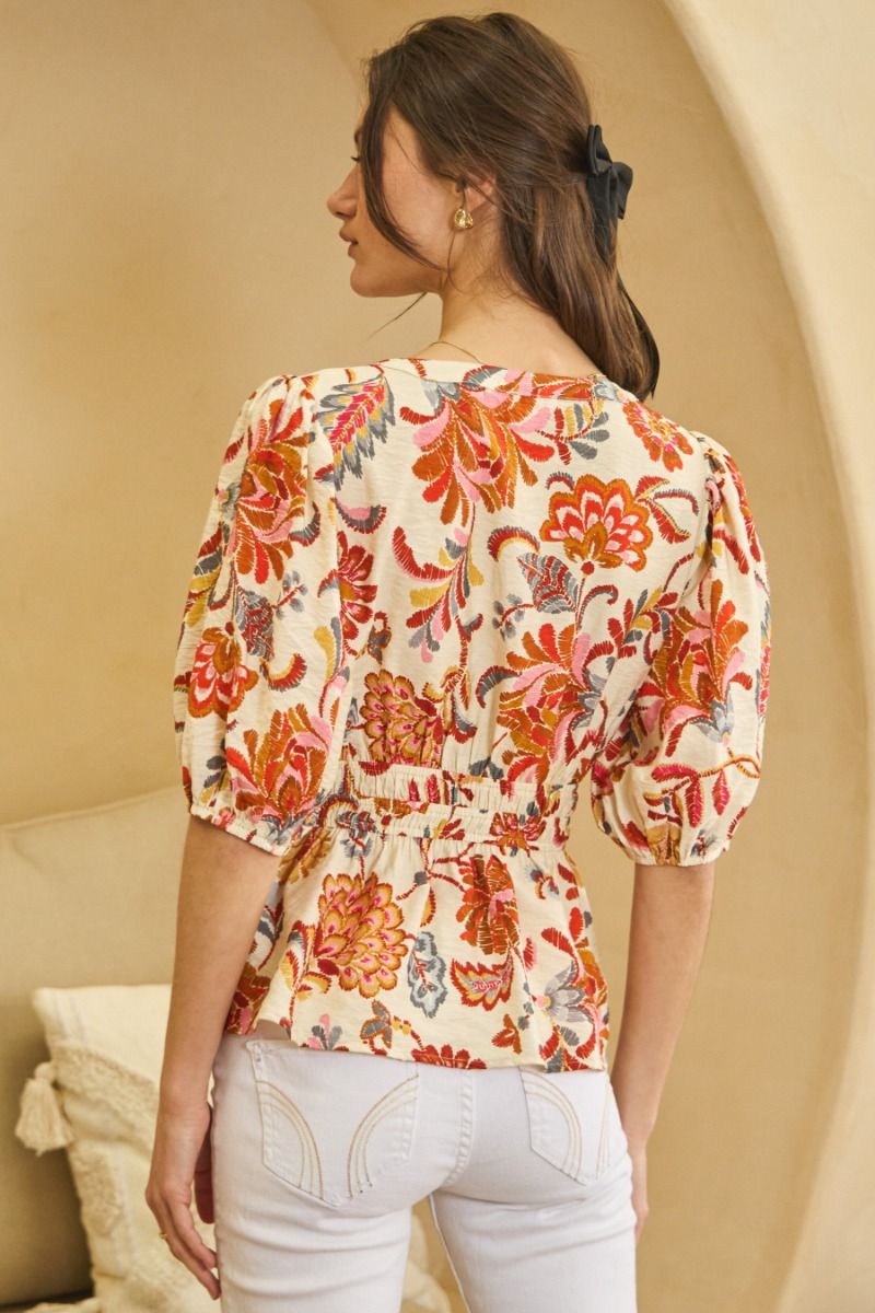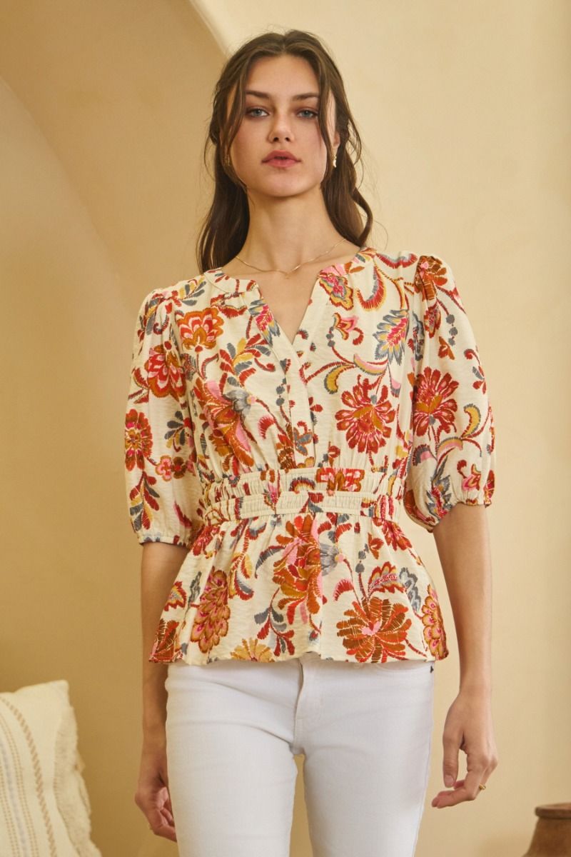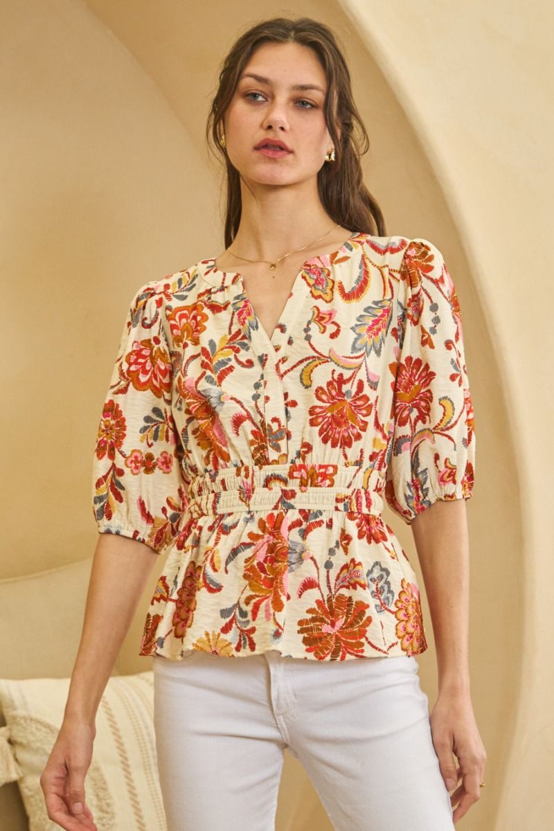 Shelly Top. Flower printed blouse with short sleeve and elastic waist. 83% Rayon, 17% Nylon. Color: Ivory Multi. Sizes: S, M, L.