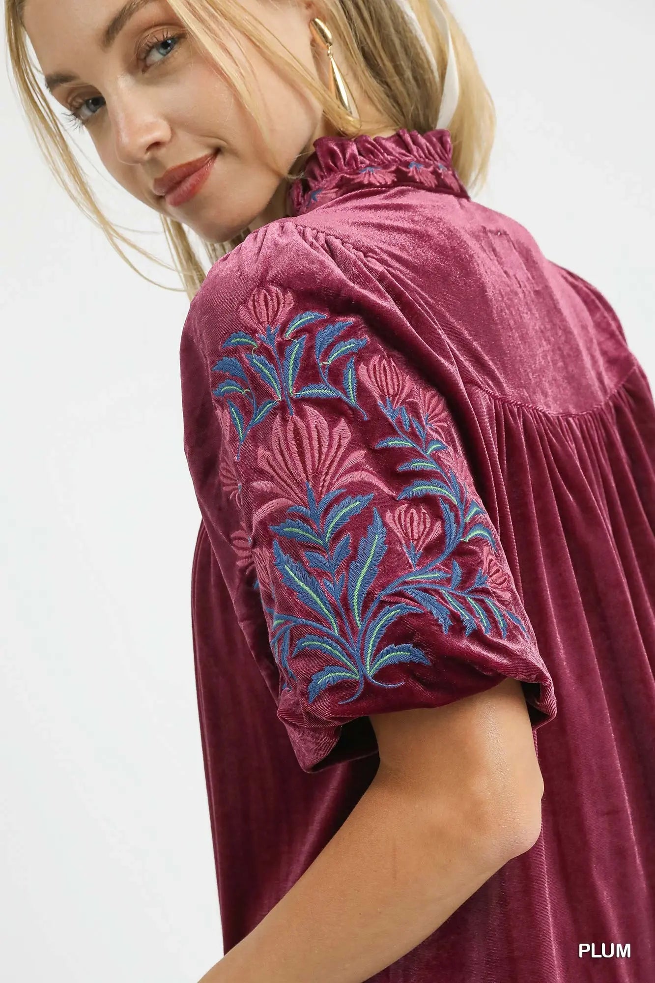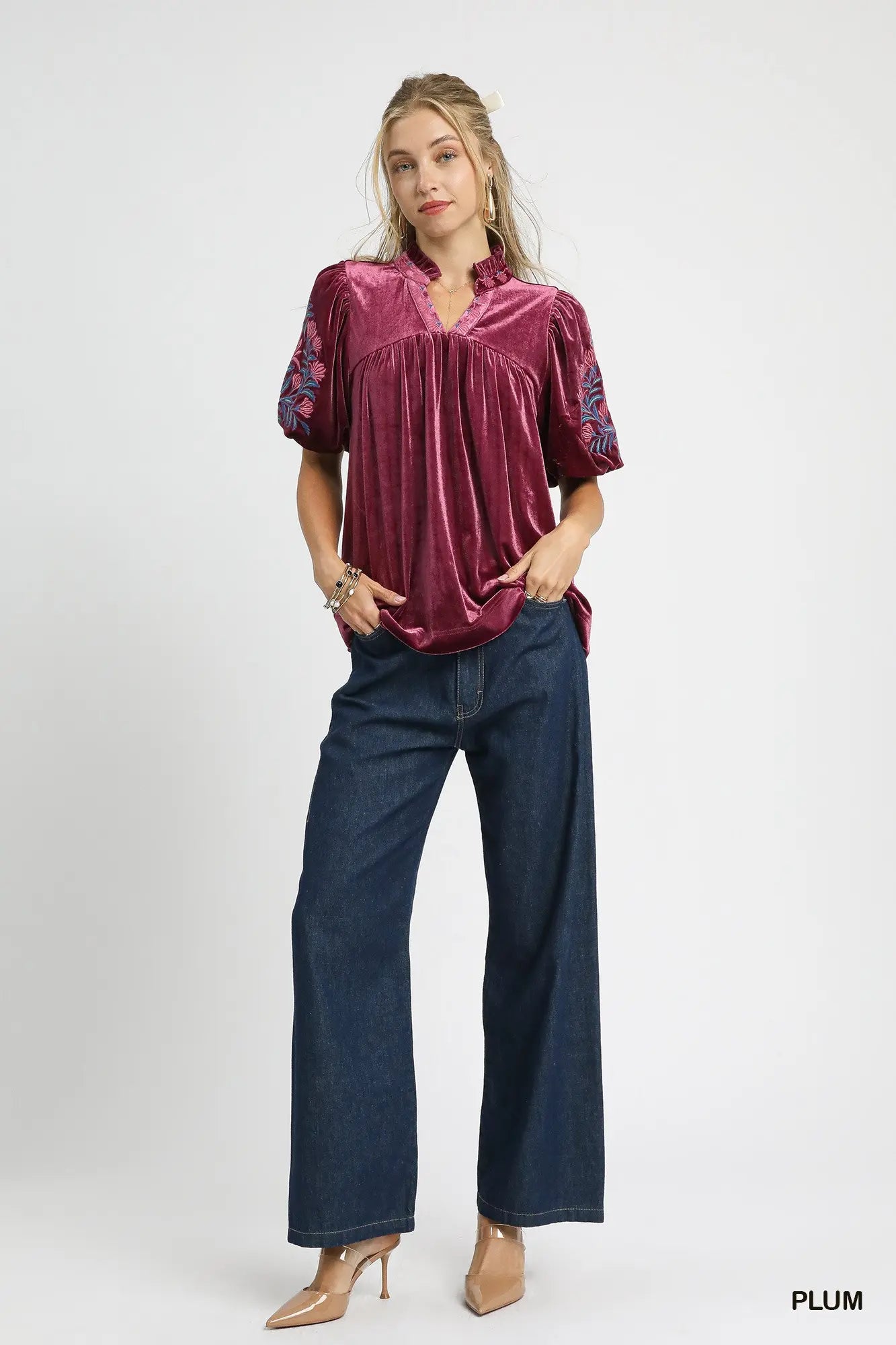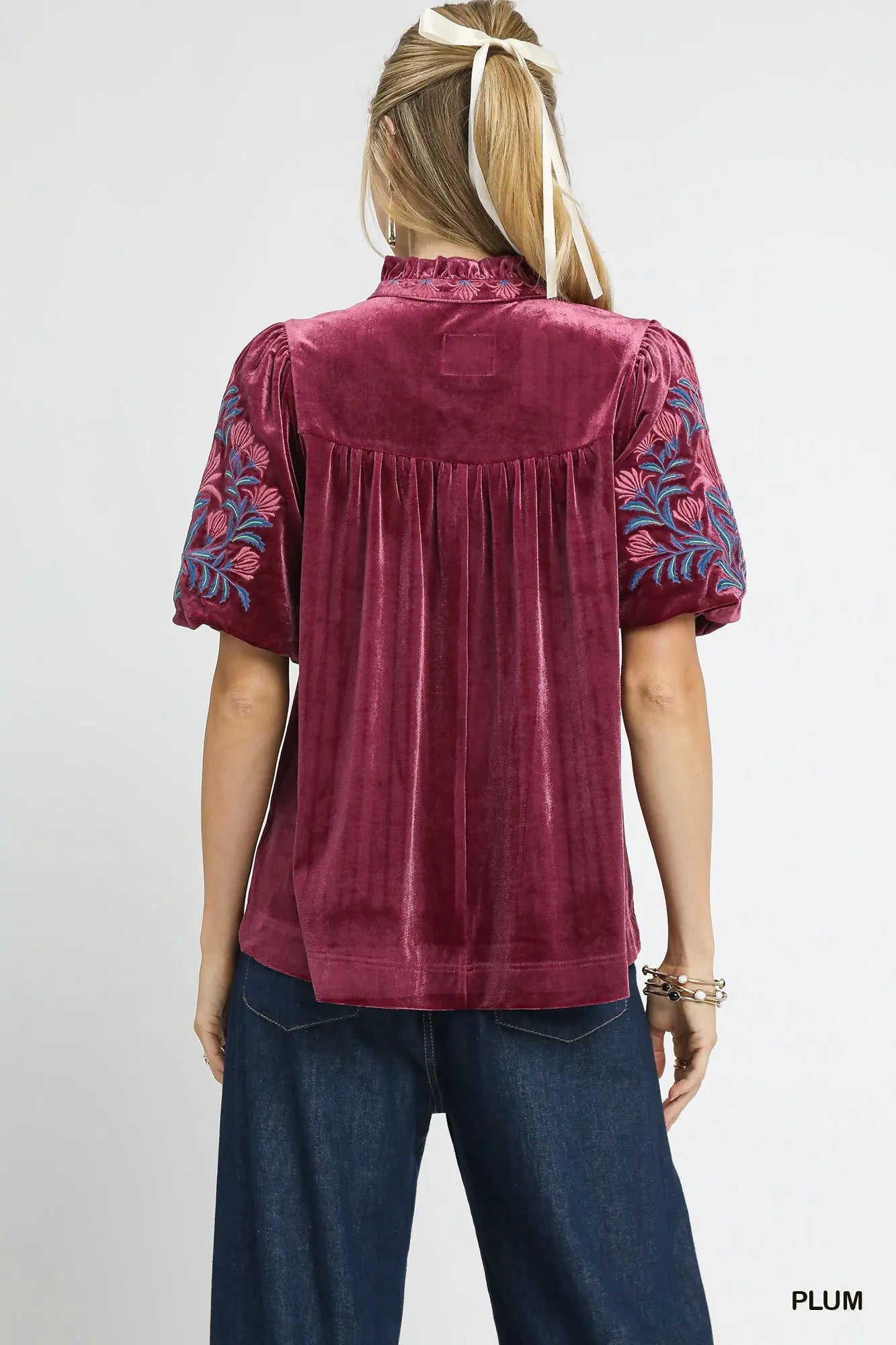 She's So Fancy Top. Velvet Embroidered Sleeve Blouse. Ruffle Neck; Short Puff Sleeves; Embroidered Sleeve; Not Lined. 97% Polyester, 3% Spandex. Color: Plum. Sizes: S, M, L.
