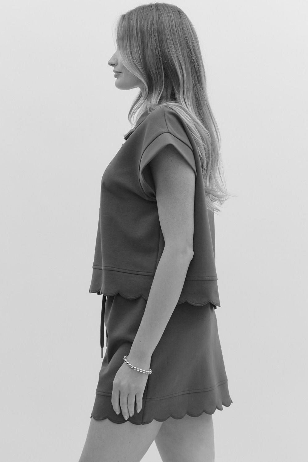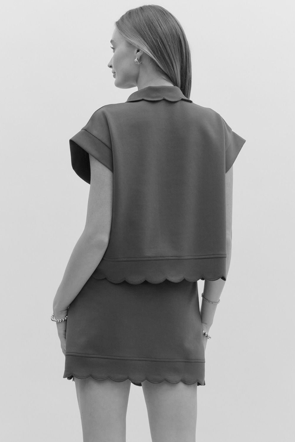 Sporty Scallop Top. Solid jersey knit muscle pullover top featuring scallop embroidered band collar snap button closure and hem finish. Unlined, knit, non-sheer, lightweight. 50% Cotton, 43% Polyester, 7% Spandex. Color: Black. Sizes: S, M, L.