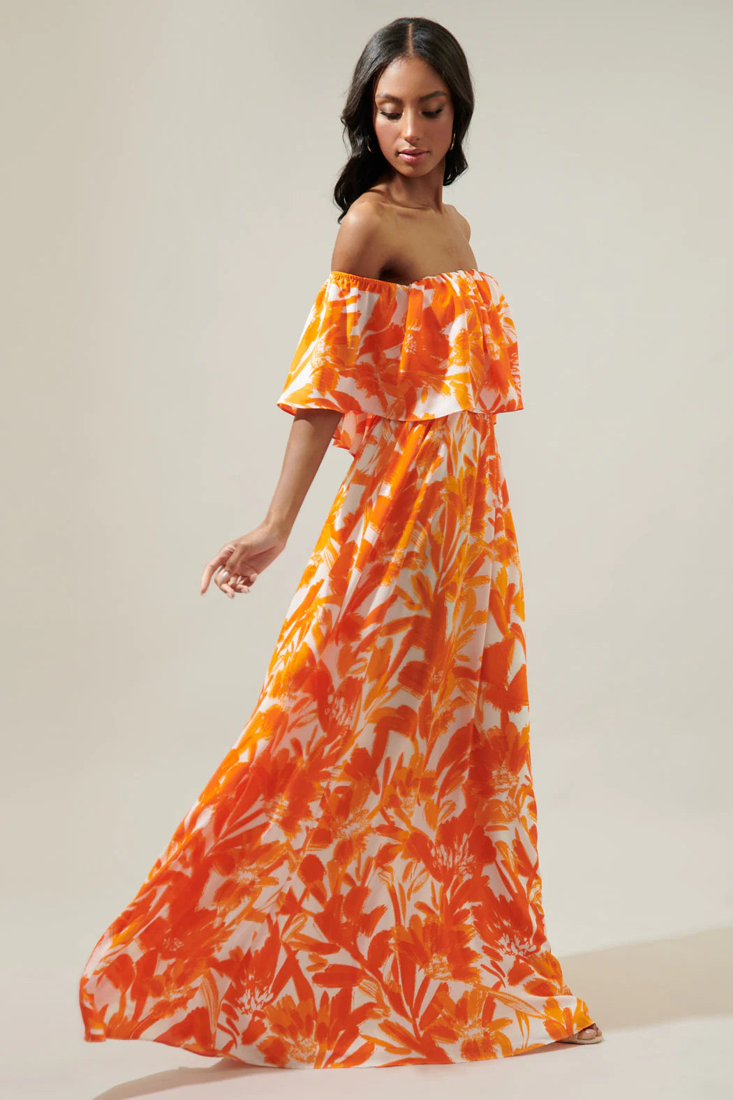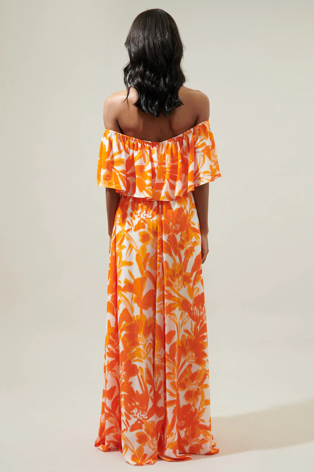 Tropical Dreamsicle Enamored Off The Shoulder Ruffle Dress. The perfect dress made for any occasion. The Tropical Dreamsicle print takes on the Enamored silhouette. An off the shoulder maxi dress with flouncy sleeves and a ruffle bib. It hides an elastic waist to create an elongated maxi look. Lined. 100% Polyester. Color: Tropical Dreamsicle. Sizes: XS, S, M, L.