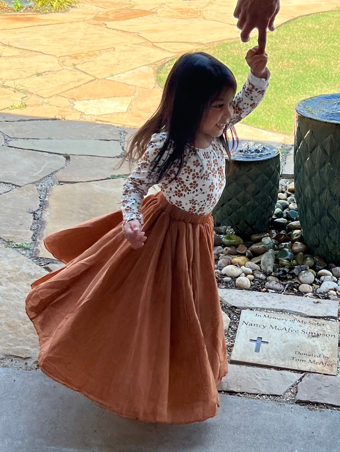 Our Princess Oakleigh is ready for the holiday season in the Aurora Maxi Skirt. It's a beautiful chiffon with satin lining, making your little Princess feel as if she's floating on clouds. We've paired it here with our Livee Long Sleeve Leotard in Wine Berry. Also available for in adult sizes for a perfect Mommy and Me style.