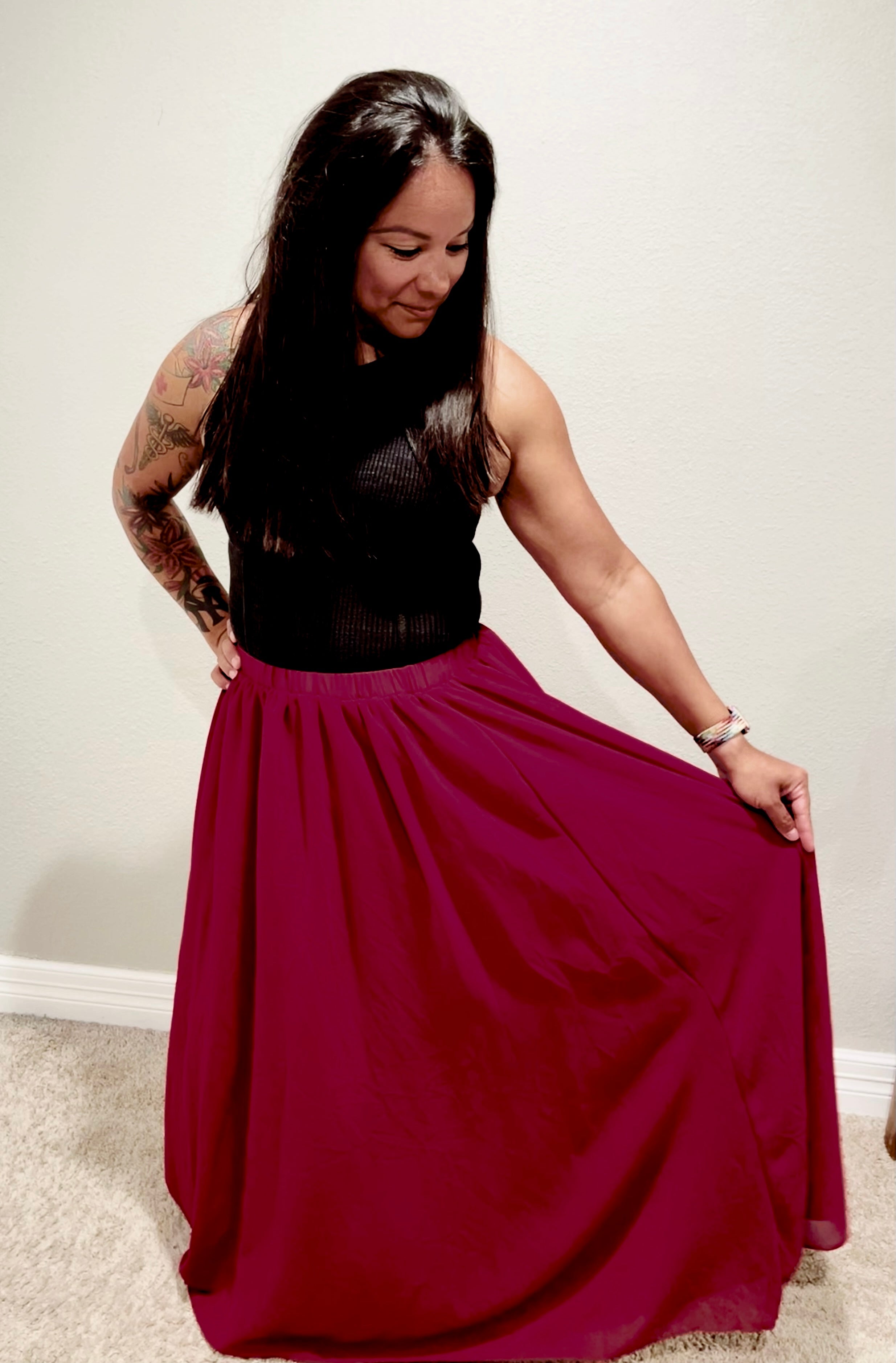 My beauty is wearing our Aurora Maxi Skirt. It's gorgeous pleated chiffon with a satin lining makes it as comfortable as it is stunning! She paired it with our Tally Bodysuit for the perfect holiday look.